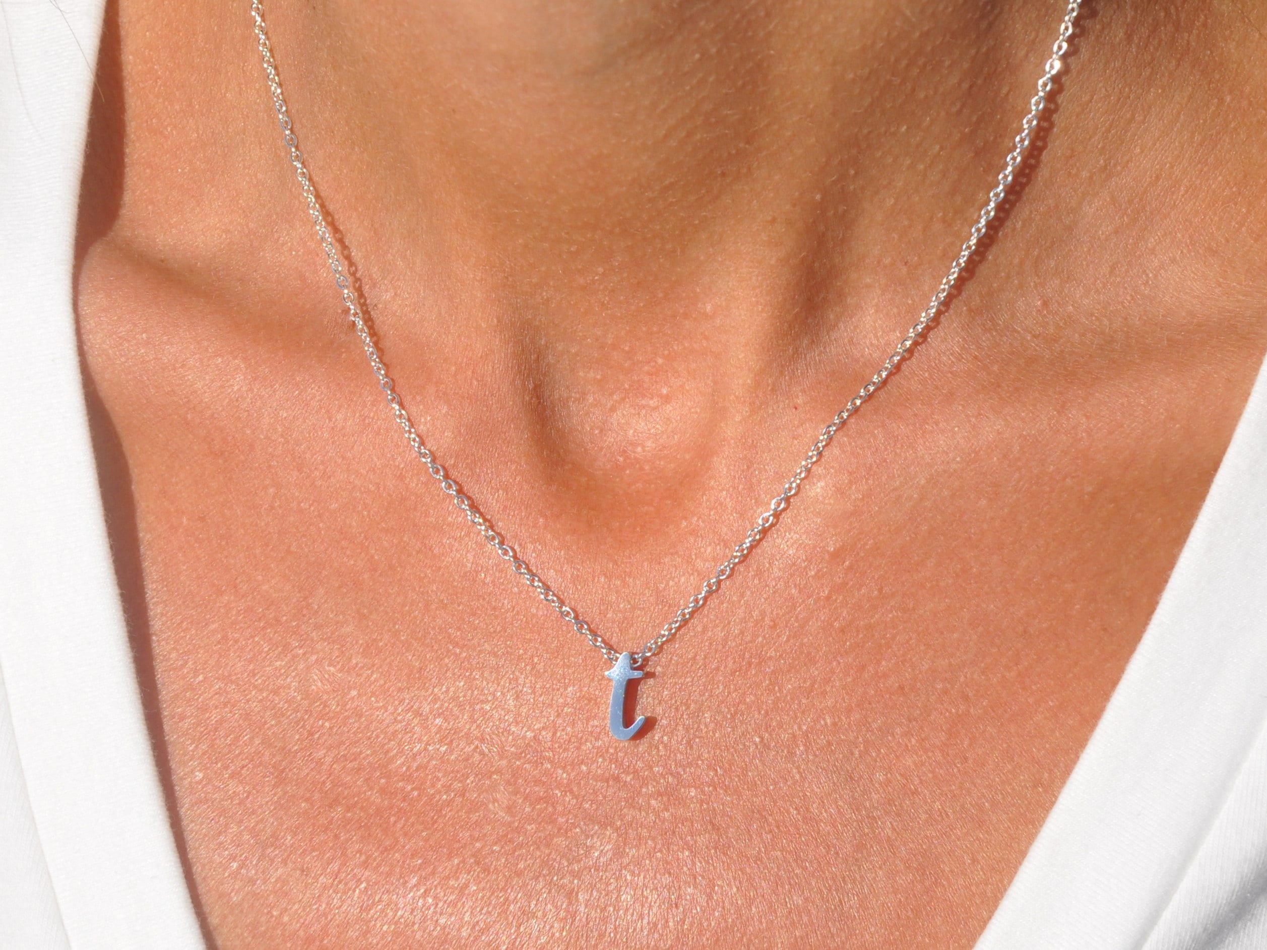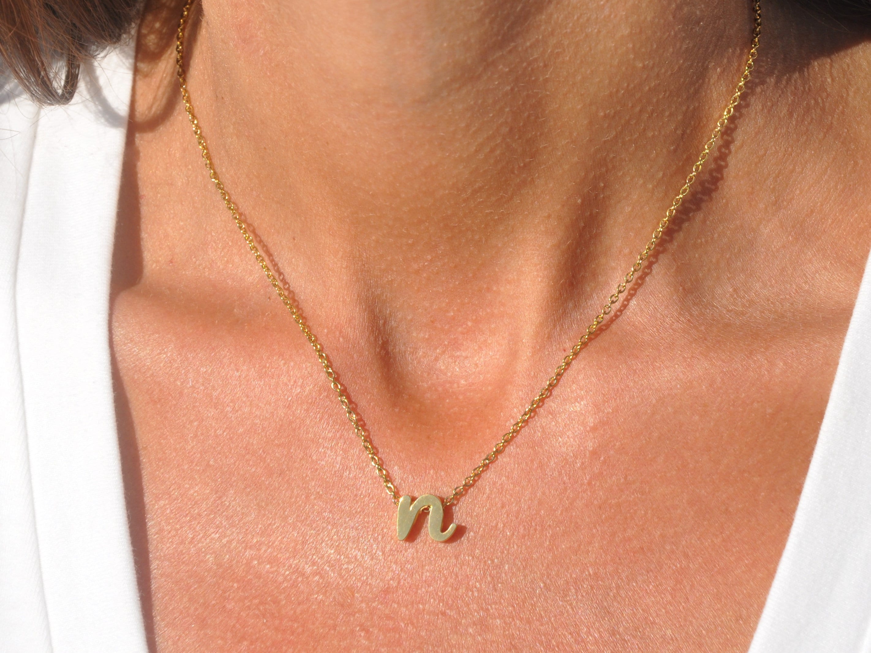 - 24K gold/rose gold/silver(stainless steel tone) plated lowercase cursive initial, measures approx. 8mm